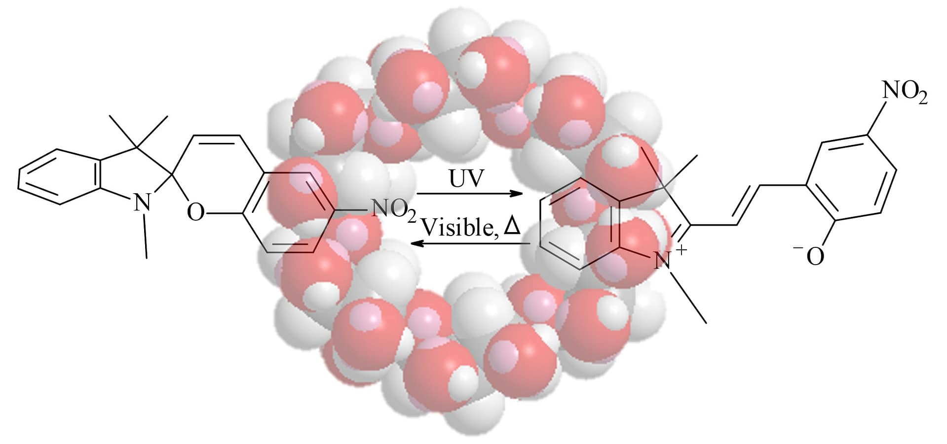 - α-CD offers a hydrophobic cavity; SP is a photochromic unit (UV: color ON, Vis: OFF).