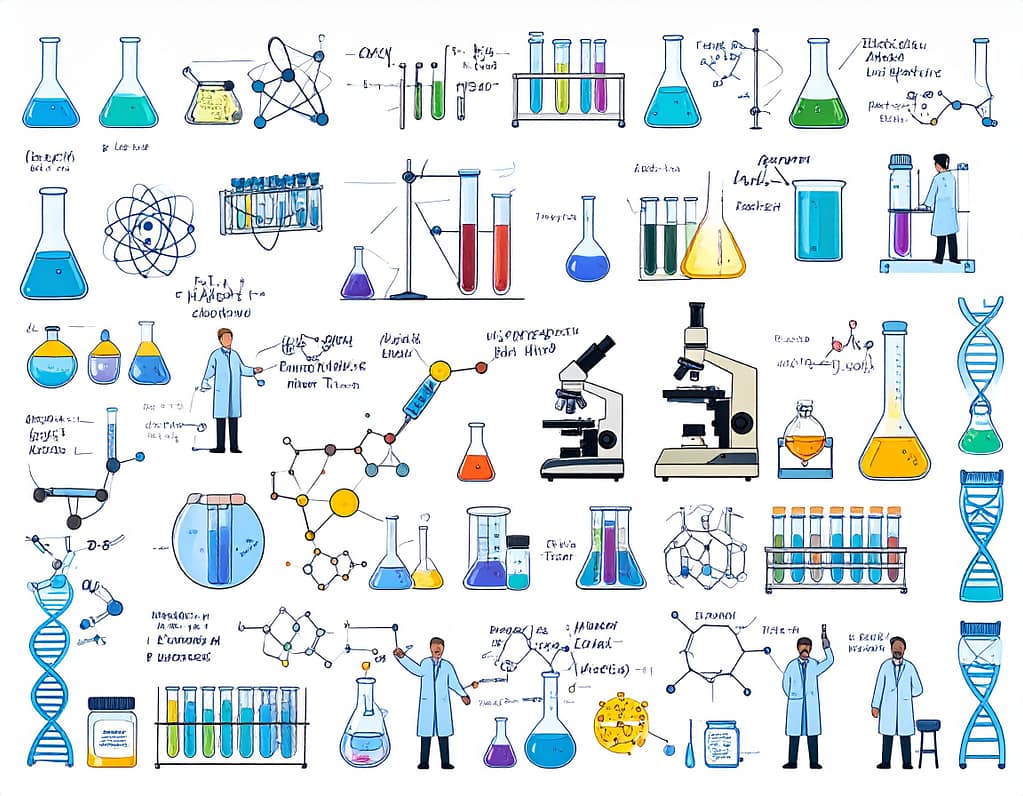 #Wissenschaftsexperiment #Labor #Reagenzgläser #Kolben #Mikroskop #DNA #Molekülstruktur #ChemischeReaktion #AnalytischeChemie #Wissenschaftsillustration