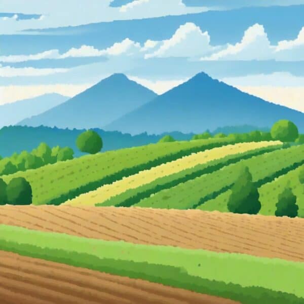 #Countryside #Farmland #TerracedFields #RollingHills #MountainRange #FurrowPatterns #EarlySummerSky #GreenPatchwork #CloudBands #LandscapeIllustration
