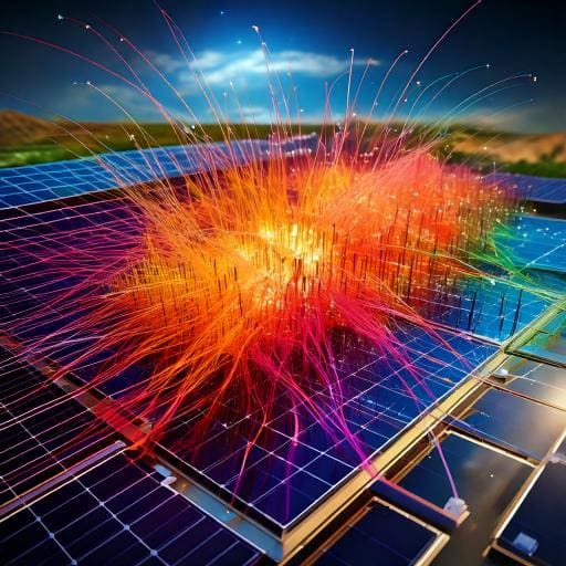 カラフルなデータビジュアライゼーションを示しています。グリッド上に配置された点や線が、虹色のスペクトルで描かれ、データの複雑な相互関係を視覚的に表現しています。赤、オレンジ、黄色、緑、青、紫の色が混ざり合い、データの密度や関係性を示しています。特に、点と線が立体的に配置されており、データの多次元的な側面を強調しています。このようなビジュアライゼーションは、データサイエンスや機械学習の分野で、データのパターンやトレンドを理解するために非常に有用です。