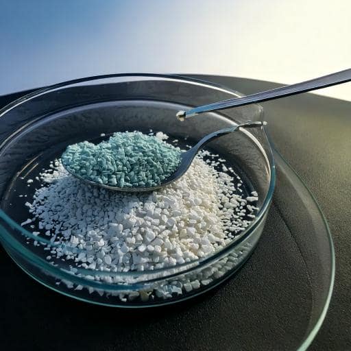 化学実験室の典型的な風景を示しています。ビーカーや試験管には、緑、青、黄、オレンジ、赤といった色の液体が入っており、いくつかの容器には泡が見えます。ガラス器具は反射性のある表面に配置されており、液体の色鮮やかな反射を作り出しています。この画像は、教育や実験のために使用されるさまざまな化学溶液や反応を示しています。