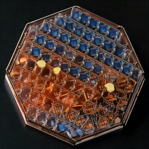 太陽光パネルの上に置かれた複数の試験管が映っています。試験管の中には、オレンジ色、黄色、緑色、青色などの異なる色の液体が入っています。各試験管には金属製の棒が挿入されており、液体の中には気泡が浮かんでいます。試験管は透明なスタンドに整然と並べられており、太陽光パネルの上に置かれていることから、これらの試験管は太陽光エネルギーに関連する実験や研究に使用されている可能性があります。液体の色の違いや気泡の存在は、化学反応やエネルギー変換の過程を示しているかもしれません。この画像は、科学的な研究や実験が行われていることを示し、自然エネルギーの利用と科学技術の進歩を視覚的に表現しています。