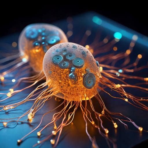 複雑な電子機器を示しています。多くのワイヤーやケーブルが接続されており、中央には輝くモジュールがあります。このモジュールは活動中の処理やデータ転送を示している可能性があります。機器はさまざまなコネクタや金属部品に囲まれており、大きなシステムや機械の一部であることを示唆しています。複雑な配線と輝くモジュールが、この機器を視覚的に際立たせ、高度な計算、データ処理、または実験用の先進的な技術であることを示しています。
