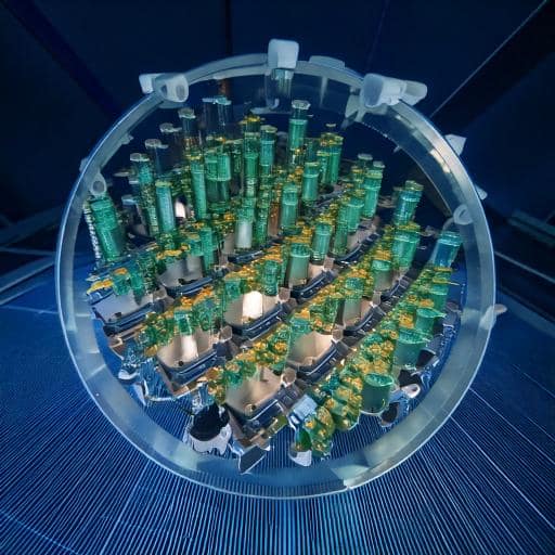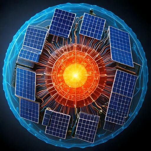 この画像は、太陽が沈むか昇る背景に広がる大規模なソーラーパネルのフィールドを示しています。フィールドの上には、機械アームで地面に接続されたドーム型の構造が浮かんでおり、これもソーラーパネルで作られています。この画像は、再生可能エネルギーインフラストラクチャーの革新的なデザインと先進的なソーラー技術を描いています。