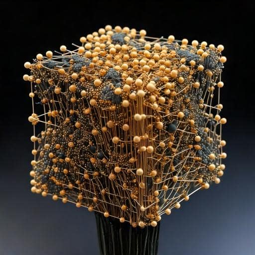立方体の形をした複雑な構造物を示しています。立方体は、多数の小さな球体とそれらを結ぶ細い線で構成されています。球体は主に金色で、一部に灰色の球体も見られます。これらの球体と線は、立方体の各面に均等に配置されており、全体として非常に精巧で緻密なデザインを形成しています。背景は暗く、立方体の構造が際立つように配置されています。この画像は、科学や技術、特にナノテクノロジーや分子構造の研究に関連するものとして興味深いです。立方体の構造は、分子や原子の配置を模倣しているようにも見え、科学的なモデルとしての利用が考えられます。また、芸術的な観点からも、その複雑さと美しさが注目されるでしょう。