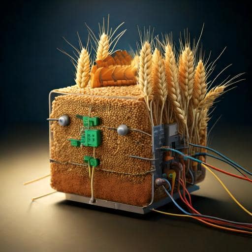 麦の穂と穀粒が密集している立方体の構造物を示しています。立方体の外側には、さまざまなセンサーやプローブが取り付けられており、これらは電線で接続されています。立方体の上部には、金網のような構造があり、穀粒がその中に詰め込まれています。この図は、農業や生物学的研究に関連する実験装置を示している可能性があります。興味深い点は、自然の要素(麦の穂と穀粒)と技術的な要素(センサーやプローブ)が組み合わされている点です。