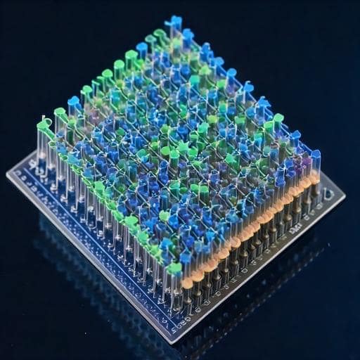 黒い背景に配置されたカラフルな立方体の集合体を示しています。立方体は透明な素材でできており、内部には細かい構造が見えます。立方体は色ごとに整然と並べられており、青、緑、黄色、オレンジ、赤、ピンク、紫などの色が見られます。各立方体は異なる高さを持ち、全体としてはグラデーションのような美しい視覚効果を生み出しています。これらの立方体は、科学的な実験やデータの視覚化、あるいは芸術作品として使用される可能性があります。特に、色の変化や高さの違いがデータの異なる側面を表している場合、視覚的に非常に興味深いものとなります。このような視覚化は、複雑な情報を直感的に理解しやすくするために利用されることが多いです。