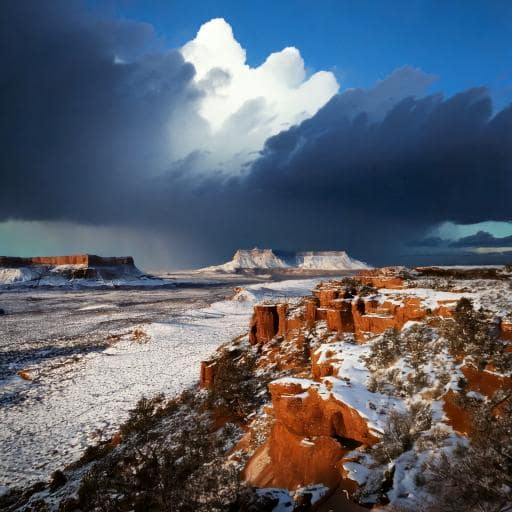 雪に覆われた曲がりくねった道路が描かれています。道路の両側には雪が積もっており、左側には針葉樹が立ち並んでいます。背景には、暗い嵐の雲と明るい夕焼けの空が対照的に広がっており、雷が空を照らしています。雷の光が空を鮮やかに照らし、自然の力強さを感じさせます。この画像は、自然の美しさと厳しさを同時に表現しており、特に雷と夕焼けのコントラストが印象的です。