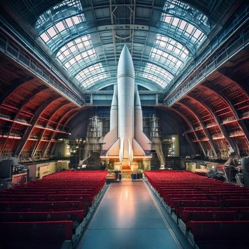 巨大なロケットが格納庫のような施設内に設置されている様子を示しています。ロケットは白を基調とし、赤いラインがアクセントとして入っています。ロケットの周囲には多数の赤い座席が並んでおり、観覧席のように見えます。格納庫の天井は高く、ガラス張りの部分から自然光が差し込んでいます。ロケットの下部には発射台が設置されており、発射準備が整っているように見えます。この画像は、宇宙探査やロケット技術の進歩を象徴しており、科学技術の発展に対する興味を引き立てます。