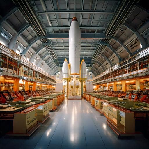 This image shows a large rocket positioned inside what appears to be a hangar or assembly facility. The rocket is predominantly white with red accents. Surrounding the rocket are numerous red seats arranged in a manner that resembles an audience seating area. The ceiling of the hangar is high, with glass sections allowing natural light to illuminate the space. At the base of the rocket, there is a launch platform, indicating that the rocket is ready for launch. This image symbolizes advancements in space exploration and rocket technology, highlighting the progress in scientific and technological fields.