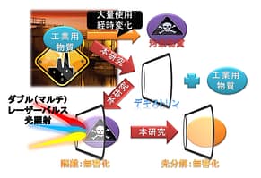 本研究ではそれら工業用物質を分子レベルで考慮し、汚染物質になる前に、食品添加物でもあるシクロデキストリンで隔離し、環境への付加の低減をめざしている。さらに、シクロデキストリンで隔離した物質を直接レーザー光により光分解(光イオン)し、そのメカニズムから効率条件を探っている。