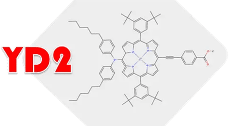 YD2は、ポルフィリン骨格にドナー–π–アクセプター構造を導入した色素であり、特にYD2およびその誘導体YD2-o-C8は、色素増感太陽電池(DSSC)において高い光電変換効率を示すことで注目されている(Chen et al., J. Am. Chem. Soc., 2009)。この色素は、ジアルキルアミノ基を有するポルフィリンをドナーとし、ethynyl基によってπ共役を延長しつつ、カルボン酸基をアクセプターとして導入することで、TiO₂表面への固定と効率的な電子注入を実現している。